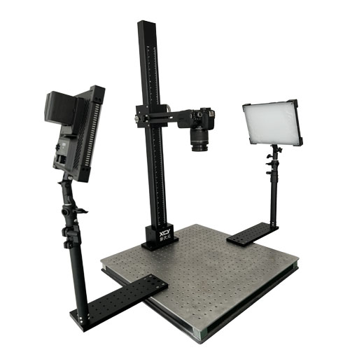 Monster600FLS采用光學(xué)面包板,表面帶有25*25mm間距M6螺紋孔陣列。主桿采用鋁材料,表面進(jìn)行黑色氧化處理,帶有厘米/英寸刻度。底部帶有支撐架,主桿位置可變,上下傳動(dòng)采用齒條齒輪結(jié)構(gòu),能調(diào)節(jié)松緊度,旋鈕把手采用不銹鋼材料,單手即可升高和降低相機(jī)的高度,相機(jī)采用螺絲固定,可以前后和上下微調(diào),前后移動(dòng)范圍0-250mm。